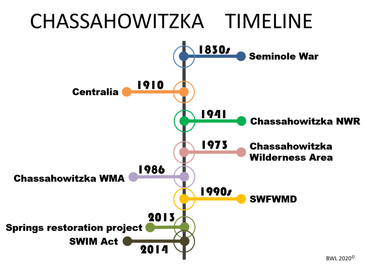 In 1941, U.S. Fish and Wildlife designated 2,742 acres of Chassahowitzka as a National Wildlife Refuge (NWR) for the protection of waterfowl and manatee1,4. The NWR presently encompasses 31,000 acres of black needlerush salt marsh from Saint Martin’s Keys to the north, south to Raccoon Point. Thirty-two years later (1973), 23,579 acres of Chassahowitzka were designated a Wilderness Area by Congress6. In 1986, a 23,183 acre track of coastal hardwood swamp was purchased from the Lykes Brothers and Turner Corporation1,7 during the Conservation and Recreation Lands Project as a Wildlife Management Area4 . The Chassahowitzka WMA is located south and east of the NWR, extending from Crawford Creek south to Weeki Wachee. The final track of 5,677 acres was purchased in the 1990s by the Southwest Florida Water Management District (SWFWMD) as coastal swamp conservation land2. This includes the headspring uplands and contiguous swamplands. SWFWMD completed the Chassahowitzka Springs Restoration Project in 2013 and approved the river as a Surface Water Improvement and Management (SWIM) Priority Water Body the following year2.