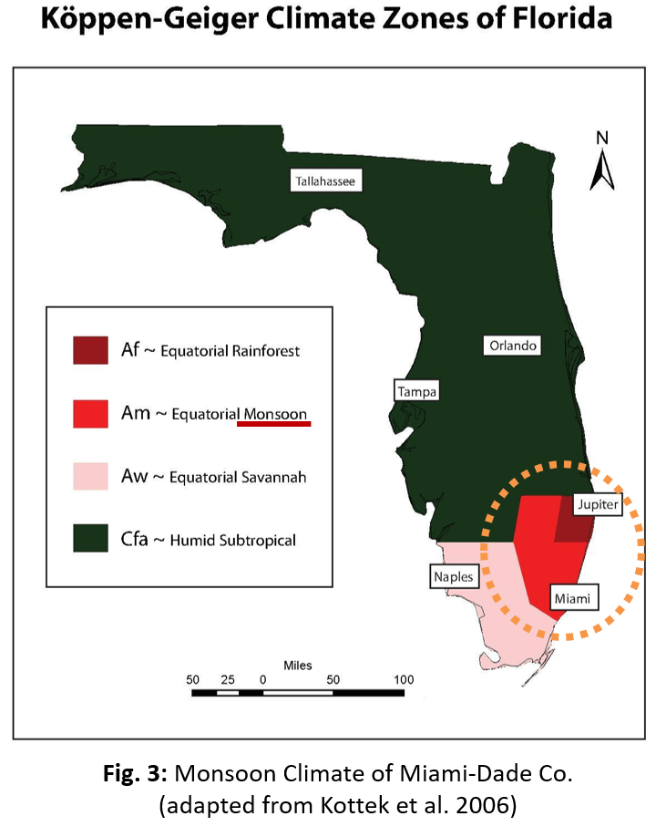So, does Florida have a monsoon climate? Well, according to the Koppen climate classification system—mostly, no (Fig. 3)3,4. To qualify as a monsoon climate, average rainfall in the wettest month would have to exceed rainfall in the driest month by at least 10-fold5,6. That amounts to about twenty inches of rain—almost twice that observed for the Amazon7.