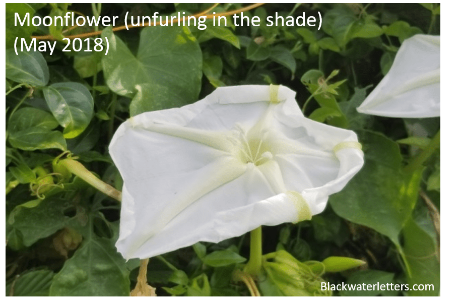 As a postscript, a friend and colleague of mine reminded me of the roles these moonflowers have played in human history. For example, since the 1500s the sap of I. alba has been used as an anodyne (for pain), as well as a laxative, and in the making of crude rubber latex3. Whereas the Datura contain psychotropic alkaloids, such as atropine and scopolamine, used by many cultures since the 1800s in entheogenic rituals4,5, and in the early 20th century to induce twilight sleep (amnesia) intrapartum by administration of morphine in conjunction with scopolamine as the amnesic6,7.