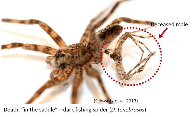 In the dark fishing spider (D. tenebrosus), males die “in the saddle”. This occurs shortly after copulation and is claimed to be due to the mutilation of their genitals2,5. Death can be so sudden, as to leave the spider dangling from their mate.